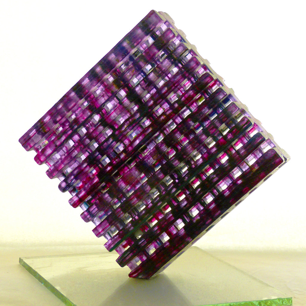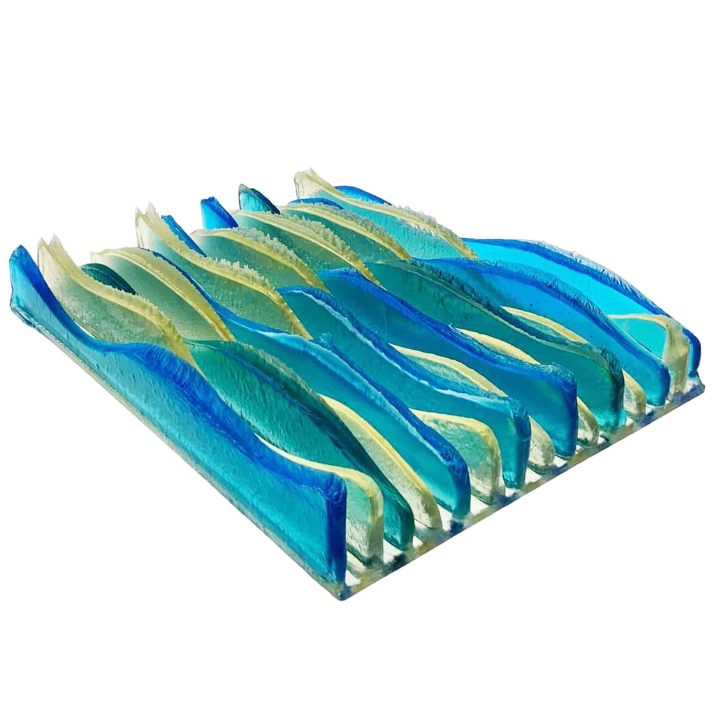 Tony’s innovative process allows for maximum project height in a single full fuse firing, enabling the creation of interesting pieces that interact with light and exhibit movement in ways that more traditional kiln-forming techniques cannot achieve.